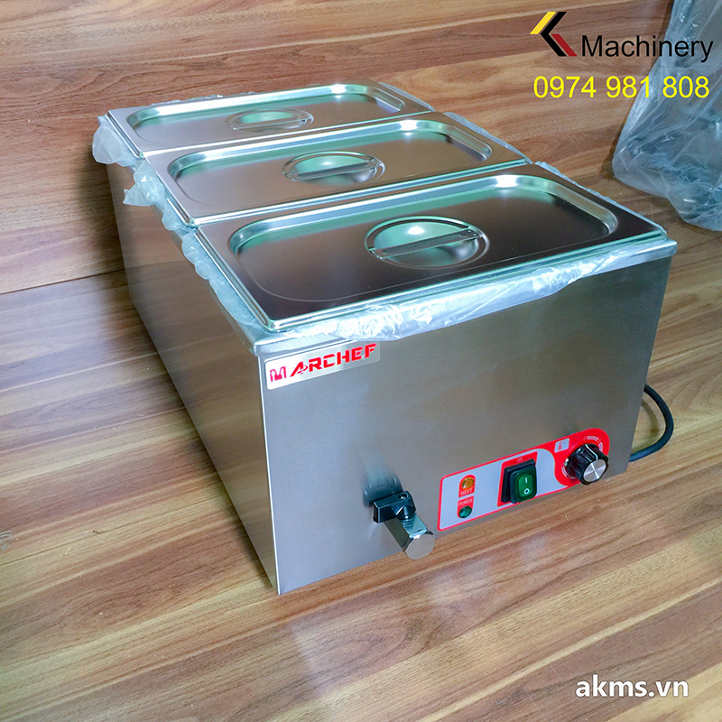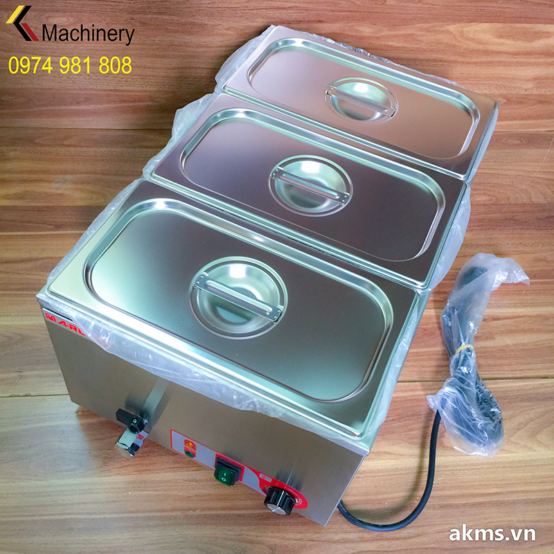 - Bếp có 01 bể chứa lớn, khay chứa thức ăn có thể tùy chọn các kích thước tiêu chuẩn size GN phù hợp với nhu cầu của khách hàng (1/1-1/2-1/3-1/4-1/6), chế tạo từ inox 304 độ dày 0.7mm, đảm bảo vệ sinh an toàn thực phẩm, đựng soup, cháo, các món canh, hầm, xào, thức ăn mềm giúp bạn phục vụ khách nhanh hơn và sắp xếp mọi thứ ngăn nắp hơn.