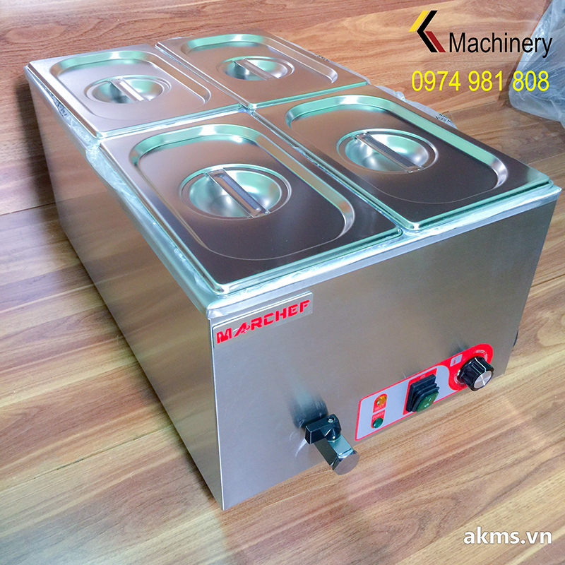 - Bếp có 01 bể chứa lớn, khay chứa thức ăn có thể tùy chọn các kích thước tiêu chuẩn size GN phù hợp với nhu cầu của khách hàng (1/1-1/2-1/3-1/4-1/6), chế tạo từ inox 304 độ dày 0.7mm, đảm bảo vệ sinh an toàn thực phẩm, đựng soup, cháo, các món canh, hầm, xào, thức ăn mềm giúp bạn phục vụ khách nhanh hơn và sắp xếp mọi thứ ngăn nắp hơn.