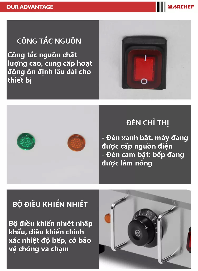 - Bộ điều khiển nhiệt của bếp gồm cảm biến nhiệt, núm xoay 5 cấp độ nhiệt dao động từ 30 – 110°C, công tắc nguồn độc lập, đèn báo nguồn và báo cấp nhiệt, ngoài ra bếp còn có van xả nước thuận tiện cho việc vệ sinh và di chuyển bếp khi cần. Cảm biến nhiệt luôn giữ nhiệt độ cài đặt không đổi, khi nhiệt độ bếp vượt quá nhiệt độ cài đặt, bếp sẽ tự cắt nguồn điện, khi nhiệt độ xuống thấp hơn mức nhiệt cài đặt, bếp lại tiếp tục được cấp nguồn trở lại để tiếp tục làm nóng.
