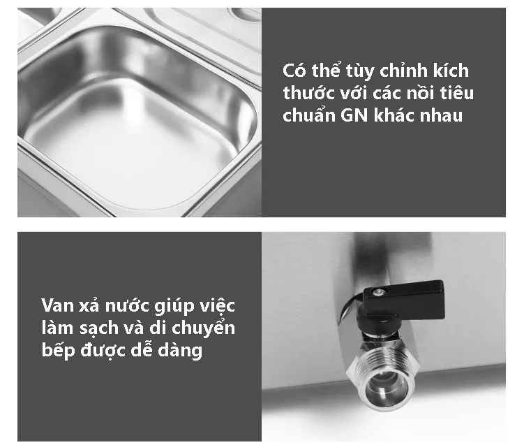 - Bếp có 04 bể chứa lớn, khay chứa thức ăn có thể tùy chọn các kích thước tiêu chuẩn size GN 1/2 x 100mm phù hợp với nhu cầu của khách hàng, chế tạo từ inox 304 độ dày 0.7mm, đảm bảo vệ sinh an toàn thực phẩm, đựng soup, cháo, các món canh, hầm, xào, thức ăn mềm giúp bạn phục vụ khách nhanh hơn và sắp xếp mọi thứ ngăn nắp hơn.
