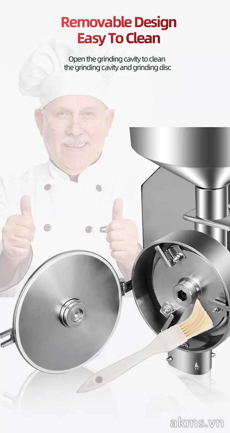 - Máy được trang bị động cơ đồng nguyên chất, công suất 2200W, tốc độ quay 1500 vòng/phút, đĩa nghiền hợp kim cứng kết hợp 3 cánh khuấy bằng thép không gỉ cho năng suất xay nghiền cao từ 20-30kg/giờ. Máy được tặng kèm 04 đĩa nghiền nguyên bản, giúp việc thay thế được thuận tiện dễ dàng