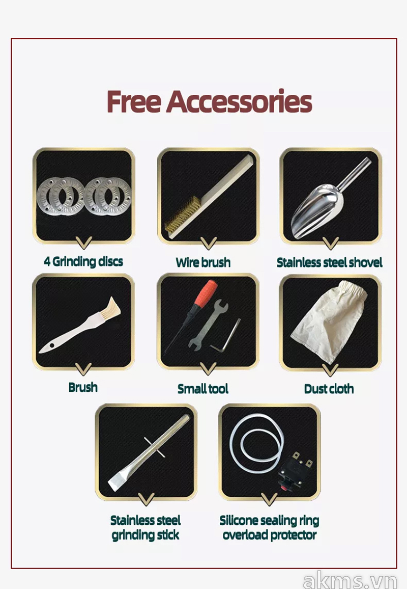 - Phụ kiện khác đi kèm máy gồm: 01 túi chống bụi, 01 thanh tiếp liệu, 01 bàn chải, một bàn chải thép, 01 thìa, 01 bộ bảo vệ quá tải bổ xung, 01 bộ trục và 04 đĩa nghiền hợp kim cứng nguyên bản.