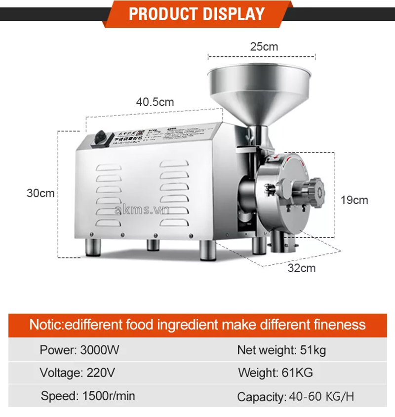 - Máy được thiết kế để nghiền các loại bột ngũ cốc như đậu, ngô, gạo, các loại hạt khác như café, hạnh nhân, các loại bột dược liệu như tam thất, tinh bột nghệ v.v.. và các loại dược liệu, nguyên liệu thực phẩm. Máy được thiết kế để nghiền hạt khô, không dùng cho hạt ướt hoặc nhiều dầu. Với hạt có nhiều dầu, nên trộn thêm các nguyên liệu khác để nghiền sao cho tỉ lệ dầu đạt <10% khối lượng.