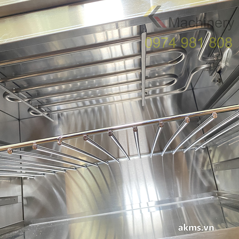 - Lò có cấu tạo chung gồm: thân vỏ bằng inox 201 bọc bông thủy tinh cách nhiệt và chống cháy, mâm đốt điện bằng inox phía trên trong khoang nướng, bộ điều khiển thời gian, bộ điều khiển nhiệt 300°C.