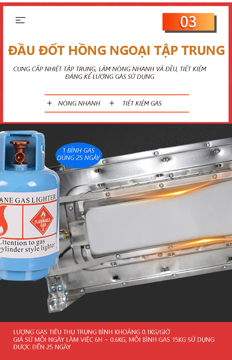 - Máy sử dụng nguồn nhiệt từ bình Gas thông thường, lượng gas tiêu thụ thấp (khoảng 0.1kg/giờ) giúp tối ưu chi phí,